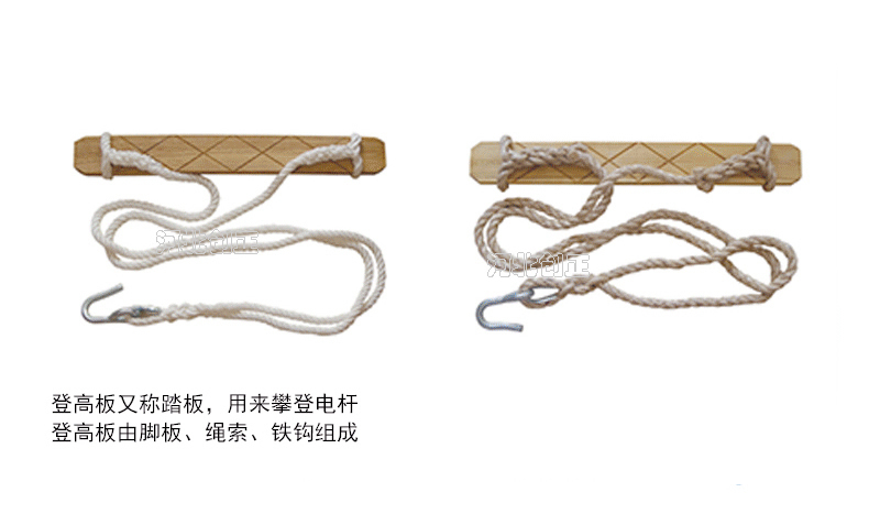 登高板又稱踏板,升降板。用來攀登電桿。登高板由踩板、繩索、鐵鉤組成。踩板用堅硬的木材制成,繩索為16mm多股白棕繩或尼龍繩,繩兩端系結在踏板兩頭的扎結槽內(nèi),繩頂部系結鐵掛鉤,繩的長度應與使用者的身材相適應。