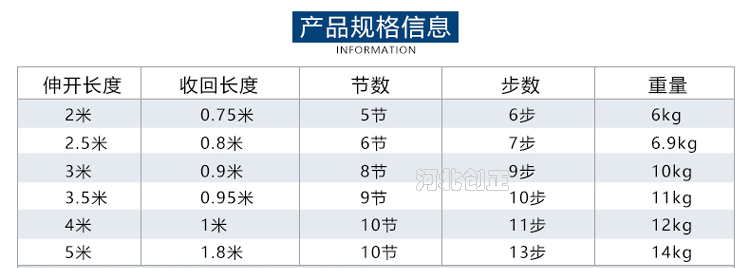 伸態(tài)5.0m, 縮態(tài)1.20m, 10節(jié), 13步;