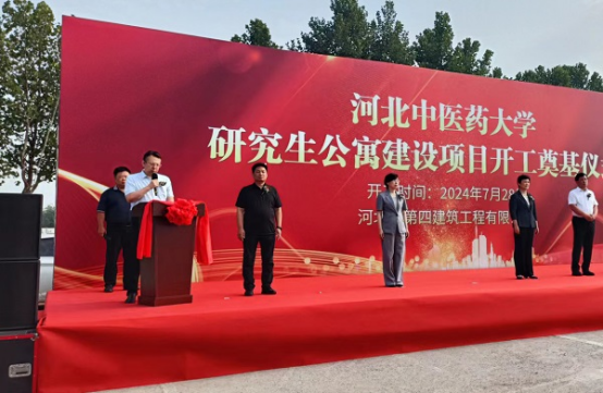 奠基儀式現(xiàn)場,挖掘機、裝載機身披大紅花整齊排列,猶如即將出征的戰(zhàn)士,工人整裝待發(fā),信心滿滿、斗志昂揚。儀式在歡快激昂的樂曲聲中拉開序幕。主持人首先介紹了參加本次儀式的相關(guān)領(lǐng)導(dǎo)和項目概況。隨后,唐志強作為施工單位代表首先發(fā)言,“我公司有幸承接該施工任務(wù),充分體現(xiàn)了項目主管部門和建設(shè)單位對我們國有建筑企業(yè)的信任和支持。河北四建一定高標準、嚴要求,為項目順利實施提供有力保證,為業(yè)主提供滿意服務(wù),為河北中醫(yī)藥大學(xué)醫(yī)學(xué)教育的高質(zhì)量發(fā)展貢獻力量!”最后,學(xué)校黨委副書記孫士江表示,河北中醫(yī)藥大學(xué)研究生公寓為省政府支持骨干大學(xué)建設(shè)項目,希望參建各方全力以赴確保按時完工投入使用,建設(shè)“品質(zhì)工程”“一流工程”,促進學(xué)校各項事業(yè)取得新成就,為經(jīng)濟強省、美麗河北建設(shè)作出新的更大貢獻!
