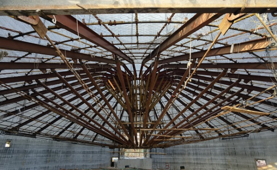 體系設(shè)計(jì)優(yōu)化,拼裝提速。“鋼筋混凝土筒倉錐殼頂板架空支撐施工工法”依托糧食類筒倉工程,筒倉建筑高度高達(dá)50米,內(nèi)徑26米,倉頂設(shè)計(jì)為錐殼頂、平頂雙層結(jié)構(gòu),斜錐殼板厚0.2米。以往筒倉倉壁一般采用滑模施工,錐殼頂板施工復(fù)雜,一般采用H型鋼組裝成圓柱形核心筒、外輻射鋼桁架平梁的方式組裝成支撐平臺,重21.9噸,用鋼量大,制作成本高;節(jié)點(diǎn)連接采用焊接,拼裝速度慢,無法滿足群體筒倉的周轉(zhuǎn)時(shí)效。分公司針對傳統(tǒng)做法的弊端,組織科研小組,專項(xiàng)研究,破解難題,最終形成了空間鋼桁架——拉索組合結(jié)構(gòu)支撐體系。該體系摒棄了3.2米直徑的圓柱型核心筒,采用直徑2.6米的傘狀中心筒,通過五道環(huán)梁環(huán)向拉接,無需設(shè)置斜撐,原結(jié)構(gòu)減輕將近1噸,節(jié)約了制作成本,而且承壓能力更強(qiáng)。重點(diǎn)節(jié)點(diǎn)還改用了高強(qiáng)螺栓連接代替焊接,拼裝速度明顯提升,施工速度更快。
